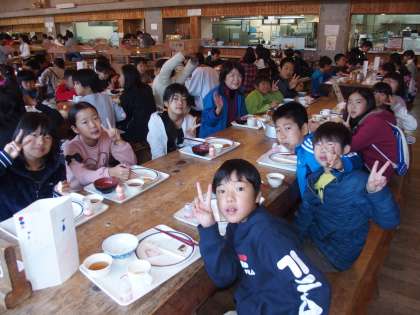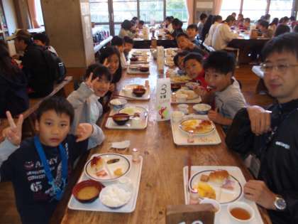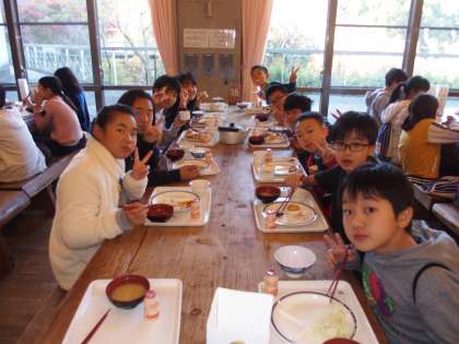 『だるまさんがころんだ大会』で大笑いしたので食欲がわいてきました。もう食堂での食事にはすっかり慣れたご様子の5年生。