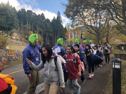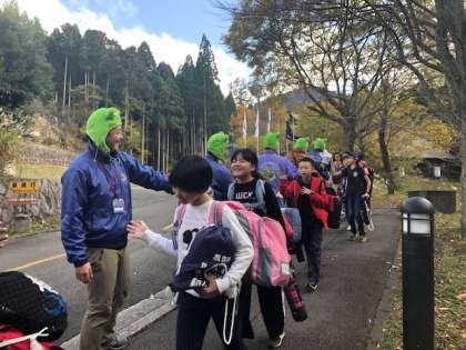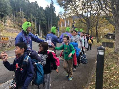 いつも恒例になっているのですが,山の家の所員さんがお見送りをしていただく中,バスに乗り込みました。無事に帰れるように「カエル」のかぶり物をして見送ってくださっています。