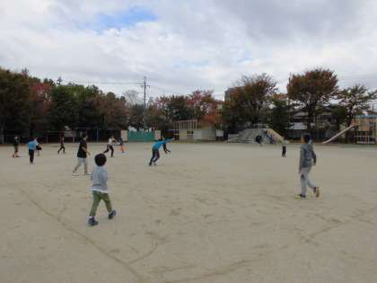 雨あがりの運動場。昼休みの子どもたちの様子を取材にいきました。ドッジボールをしたり,ドッジビーをしたり,鬼ごっこをしたり。みんな,思い切り運動場を入りまわっていました。