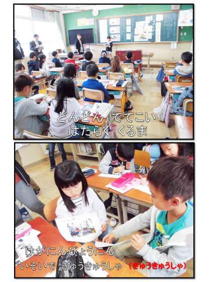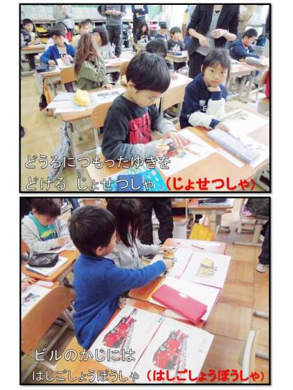 国語の学習で『じどう車くらべ』の学習をしています。今までトラックやバス,乗用車,クレーン車のしごとやそのつくりを学習してきた1年生。今日は自分が選んだ自動車の「つくり」を考えました。授業の始めにはあの永遠の名曲『はたらくくるま」を熱唱し,1時間しっかりと考え学習することができました。