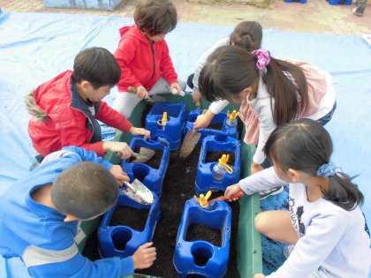 土を新しくし,栄養満点の土に球根を植えました。これから水やりをがんばって,春にはチューリップを満開にしたいと思います。寒さにも負けず,がんばれ1年生!!がんばれチューリップ!!!