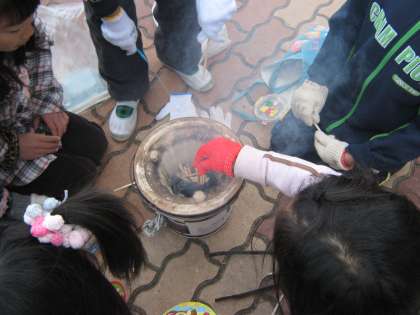 社会の「昔の道具しらべ」の一環として、七輪でおもちを焼きました。風の強い日でしたが、火を自分たちで起こし、火力を調整したりと、子供たちは悪戦苦闘しながらもしっかりやり遂げました。最後にはみんなでおもちを焼いて頂きました。美味しかったね!!