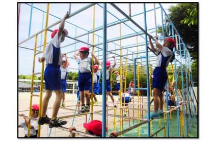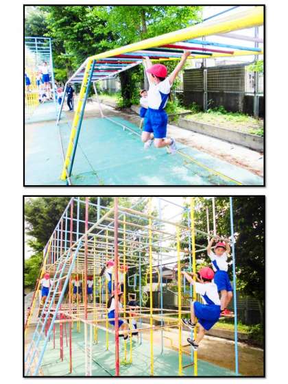 うんてい,総合遊具,築山をつかってゆうぐあそびをしました。うんていでは,一つとばしや二つとばしをしてスイスイ進んでいく子もたくさんいました。総合遊具や築山では安全に気をつけて,活動することができました。楽しいゆうぐあそびに,子どもたちはハッスルハッスル!