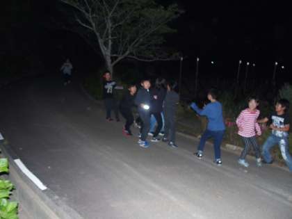 こうして始まったナイトウォーク。『余裕さ!』と笑顔で歩く子もいれば,スタート前から涙目の子もいます。しかし,グループみんなで力を合わせ,勇気をふりしぼって,最後までがんばりました。3枚目の写真は『みさきの魔王』に出会ってしまった9班です。しっかりとしゃがみ,物音ひとつ立てず『みさきの魔王』をやりすごすことができました!