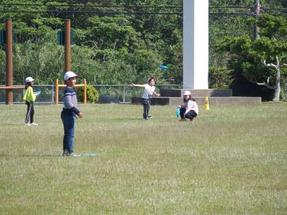 そうです。フライングディスクゴルフです。野外炊事でへとへとになるまでがんばった4年生ですが,「フライングディスクゴルフは別腹!」とばかりにおおさわぎ。とっても楽しい時間を過ごしました。