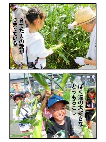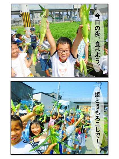 前回の枝豆の次は「とうもろこし」です。とうもろこしを植えて,地域の方がお世話をしてくださったおかげで,すくすく大きくなりました。今では3年生の背丈よりも大きく成長しました。