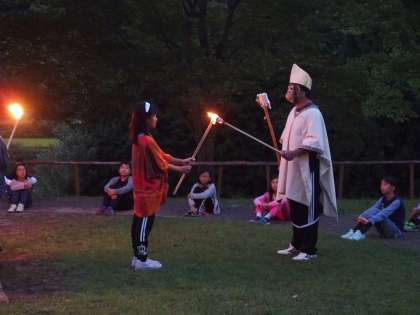 キャンプファイヤーを始めるのに足りないもの,それは火。みんなで火の神様と火の子を呼びました。火の神が火の子に授けた火は4つ。