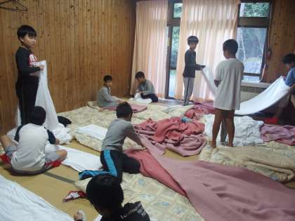 最終日の朝は大忙しです。朝起きるとすぐに寝具の整理をします。仲間と協力してふとんやシーツをたたみます。はしをしっかり合わせてたたんでいくのは,少し難しかったですが2人で協力してたためました。自分の整理が終わると次は仲間のもとへ・・・。