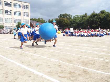大玉が大きくて(大玉だから当然ですが)言うことを聞いてくれない!特に低学年は悪戦苦闘の連続。あっちに転がりこっちに転がり・・・。だからこそおもしろい。だからこそチームワークが必要。単純な競技ですが実に奥が深い!本日の大玉送りには,この競技の魅力がいっぱい詰まっていました。