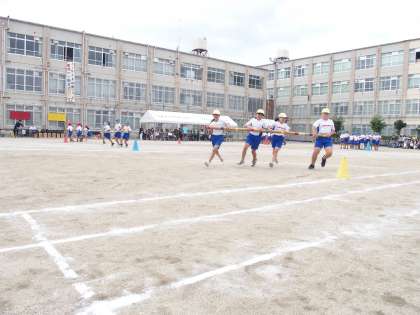 みんなで長い棒をもって猛ダッシュ。コーンのまわりをいかにロスなく回ってくるかがポイントです。練習では各色ごとに何度も何度も話し合いをして,勝つための工夫を重ねてきました。その成果が一番出たのは何色かな?
