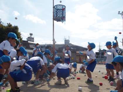 1年生の団体競技は玉入れです。入場する姿からかわいくて,運動会の雰囲気がパッと和らぎます。かわいいダンスも披露してくれました。