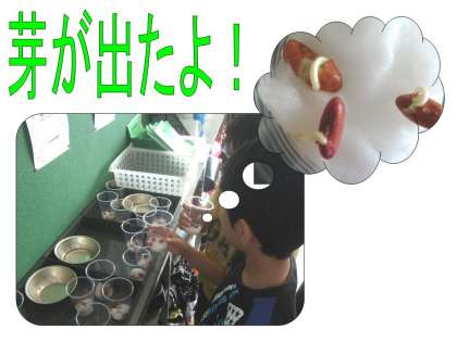 理科の学習「生命のつながり」で,育てているインゲンマメから芽が出ました。