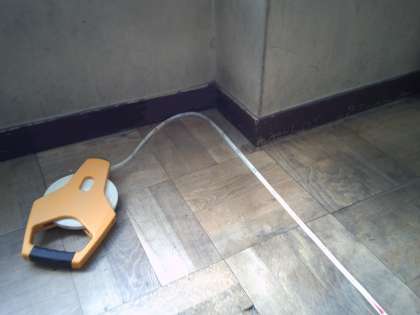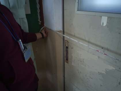 5年生のみなさんがいない教室は,がらんとしています。そして「意外と教室って広いんだなあ・・・」と思うのでした。「教室ってどれぐらい広いのかな?」そんな疑問を持った私たちは,メジャーを片手に教室の長さを測りました。