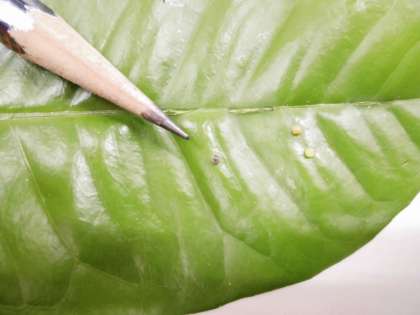 おっと,先生たちが校庭で生き物を探していると,夏みかんの葉に小さなたまごがついていました。