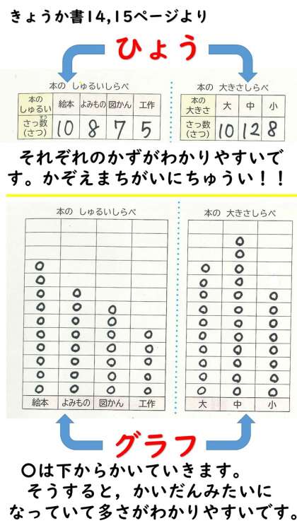グラフ…ひょうのかずだけ下から〇をかいていきます。かいだんがたかいところはかずが多い,ひくいところはかずがすくないことがわかります。