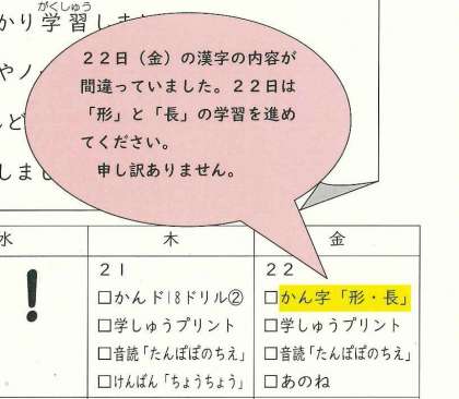 2年生の学習計画表の22日(金)の課題が以前やったものになっていました。