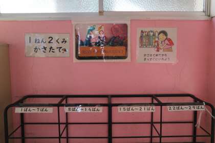 がっこうに かさを さして きた ときは,じぶんの くらすの かさたてに,まるめて,いれましょう。