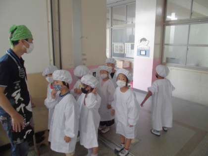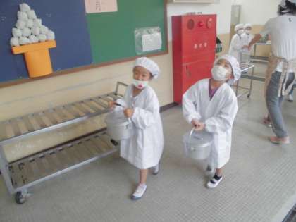 今年度初の給食当番がやってきました。新しいエプロンに新しい給食帽。