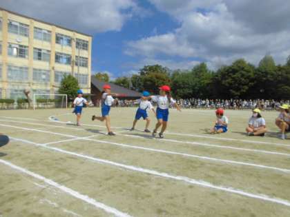 勢いよくスタートダッシュし,ゴールを突っ切る3年生。