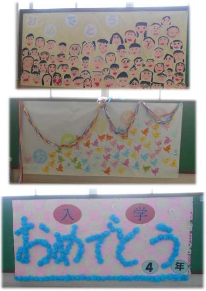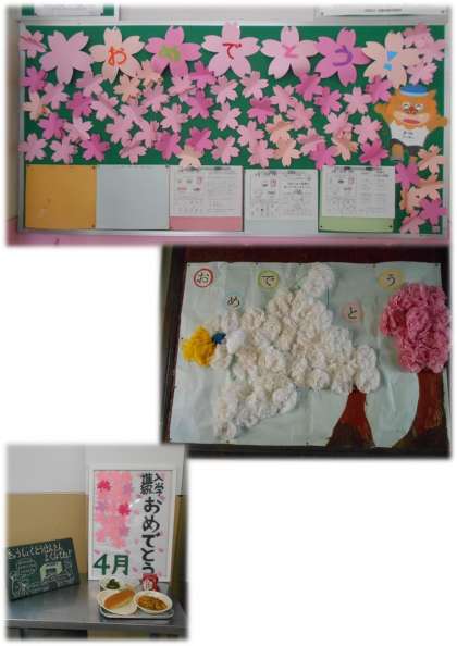 入学をお祝いする掲示板です。校舎に入ってもらうことができなかったので,HPを通じて紹介です。給食室でもお祝いのメッセージボードを作成されていました。27日には,ビデオを通じて,1年生の入学をお祝いする会を行います。1年生65名,新たな川岡東の仲間として,心のつながりを作っていきたいと思います。