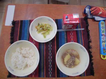 今日の献立は「肉じゃが,ゴマ酢煮,麦ごはん,牛乳」です。