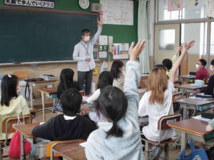 小林先生の趣味は「フルマラソン」と「弓道」ということで,みんなは「僕もフルマラソンを走ってみたい。」「42.195キロは算数でも出たね。」「弓を引き絞って的を射てみたい。」などなど,思い思いの意見に花を咲かせていました。