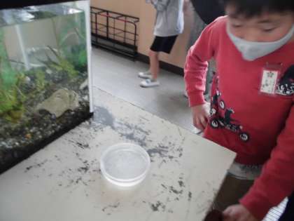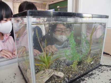 みんなそれぞれのめだかに名前を付けたり,水草にたまごがついていないかを見たりと,思い思いにアクアリウムを楽しんでいるのでした。