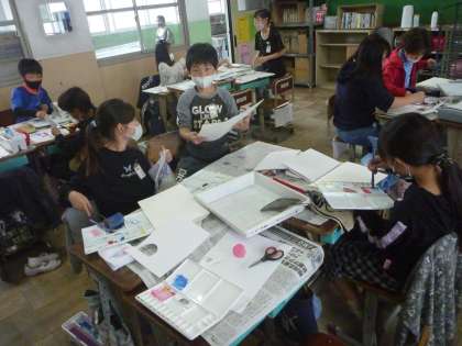 スパッタリング,マーブリング,デカルコマニーなどの技法。使うものは,歯ブラシ,網,ビー玉,ローラー,スポンジなどなど。