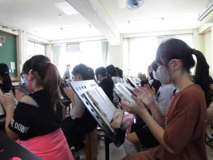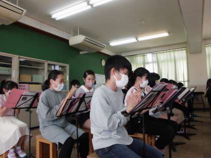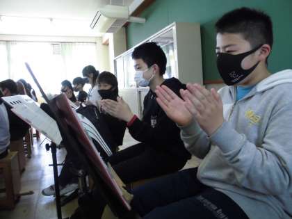 手拍子で2パートに分かれて演奏しています。付点四分音符や八分音符など,さまざまな長さの音符が入ったり,pやmfなどの強弱を意識する記号が入ったりと難しい曲ですが,一生懸命取り組んでいます。息の合った演奏ができるように今後もがんばっていきたいですね。