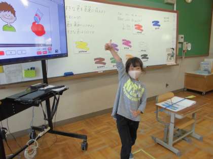 なかよしで外国語の学習をしました。テーマは「色」。色をさし棒でさしながら英語で言う練習をしたり,歌に合わせて色を言う練習をしたりしました。What color do you like? に対してI like ○○.と笑顔でポーズをしながら答えることもできました。楽しく英語活動に取り組んでいます。