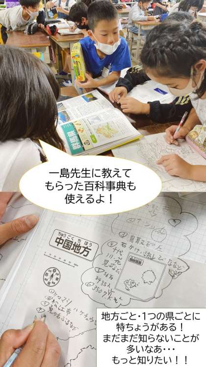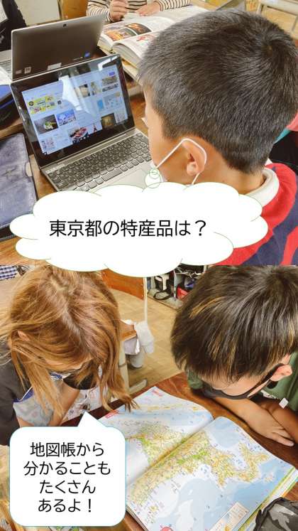 各都道府県の特産品や観光地を調べるために使えるものは,GIGA端末だけではありません。川や山,盆地の名前までくわしく書かれている地図帳。ものごとをイラストや写真付きで分かりやすく伝えてくれる百科事典。忘れがちですが,普段から読んでいる教科書も調べ学習に欠かせないツールの1つです。自分たちが必要な情報は何かを考え,適切なものを選び,まとめていくことができるよう,日々鍛錬を重ねていきます。