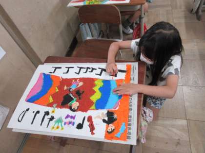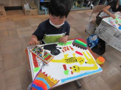 恐竜が飛び出す子,動物の世界が広がる子,音楽会が始まる子など,想像力豊かに描いていました。完成するのがとっても楽しみです。