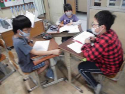 インタビューする人,される人,そのやり取りを記録し,報告文にする人,3人一組で学習を進めています。