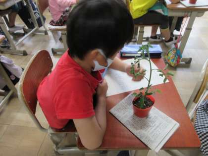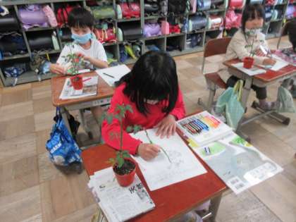 茎や葉の色や葉の形をよく見て観察カードにかいていたみんな。さらに,手ざわりを確かめて,においをかいで,いろいろな発見をしていました。