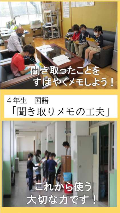 国語の学習で,話を聞いてメモをとる学習をしています。そのまま全ての内容を書き留めるのではなく,大事なポイントを考えて,省略してメモしたり,記号で表したり,ひらがなで書いたりと,いう工夫を学習しました。それを活用して,今日は実際にインタビューに行きました。上手くいったところ,難しかったところ。実際にやってみたからこそ,いろいろなことが考えられたと思います。これから使っていく大切な国語の力です。