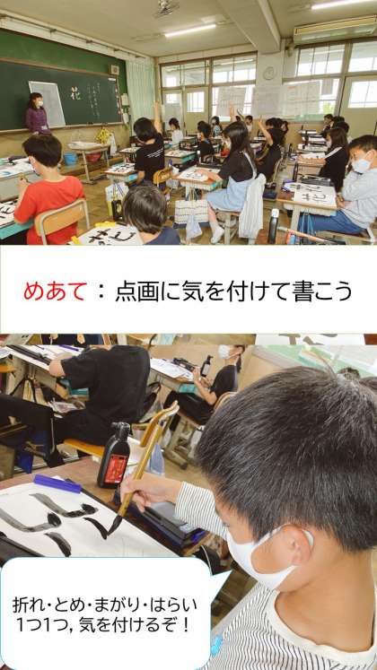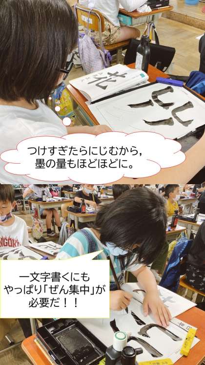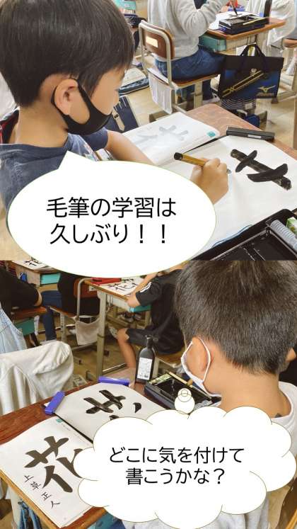 待ちに待った毛筆学習が始まりました!久しぶりの書写でしたが,準備の仕方から片付けまではもうお手の物,スムーズに書く段階に入ることができていました。