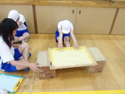 今日のNew physical strength testは,反復横跳び,立ち幅跳び,長座体前屈の3種目です。去年の自分の記録を超えるため,今までの自分に別れを告げ新たな自分に生まれ変わるため,どの種目も真剣に本気で挑んだ6年生。