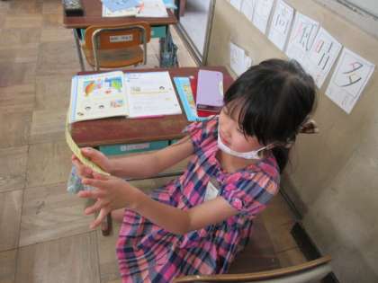 算数科「長さ」で,ものさしを使って何cmか長さを図る学習をしています。