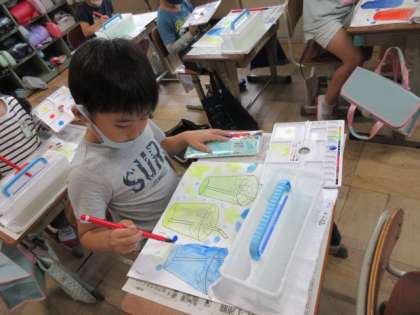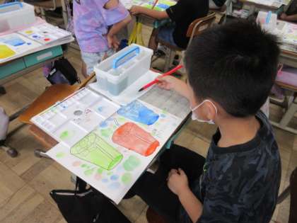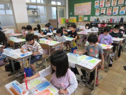 2年生になって初めて,絵の具の学習をしました。みんな,朝から絵の具セットを嬉しそうに持って来て,使うのを楽しみにしていました。