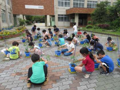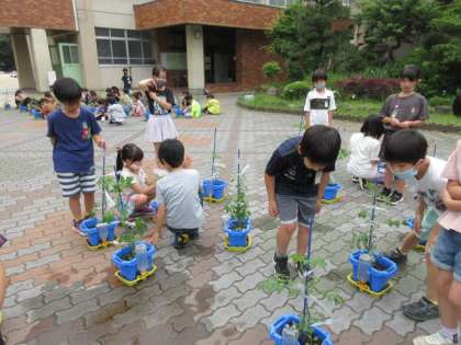 そこで,今日の生活科の時間に,支柱を立てました。少し曲がっていた茎もしっかりと伸びました。これでぐんぐん伸びていけますね。