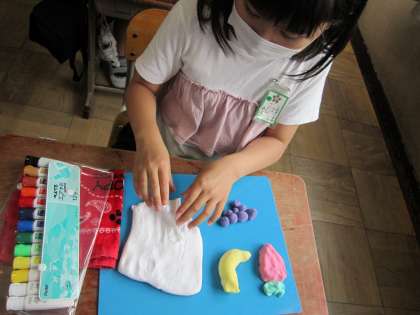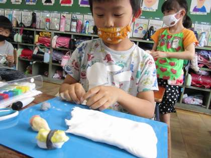 紙粘土に絵の具で色をつけ,ごちそうを作りました。
