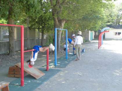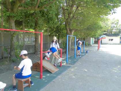 なかよしの体育では「鉄棒運動」を行っています。いままでできる技をさらに極めたり,新しい技にどんどん挑戦したりと最後まで諦めずに楽しく取り組んでいます。