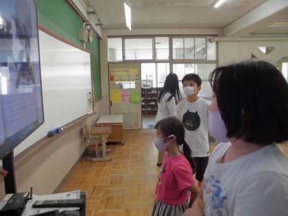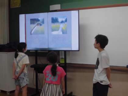 国語科で学習した「うごいちゃだめ!」の絵本の役割読みに挑戦しています。カラスの声や風が吹く様子を声を変えて読み,雰囲気がよく出ています。「うごかない。」と何度も出てくるフレーズはみんなでそろって読んでいます。楽しみながら読む練習を頑張っています!