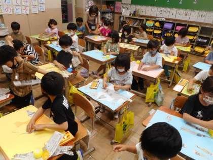 昨日に引き続き,図画工作では紙をやぶいて,どんな形に見えるのか想像して,絵を描きました。