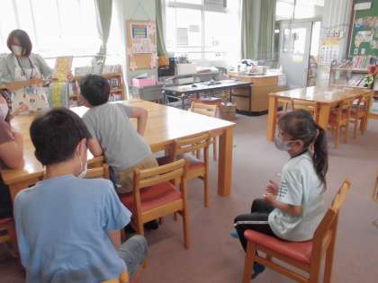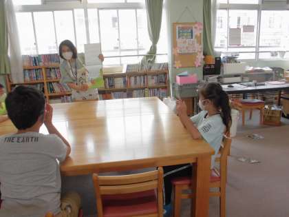 読書週間がはじまりました。今日は図書の一島先生から図書室で「もりの100かいだてのいえ」や「おたんじょうび」の本の読聞かせを聞きました。興味をもって聞いていました。いろいろな本を読んで心の栄養にしてほしいと思います。