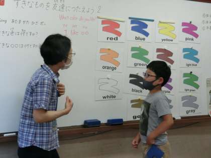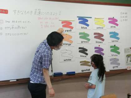 外国語の学習では「何が好きですか?」をテーマに学習をしています。「What color do you like?」という質問に対して「I like pink.」など好きな色を答えられるようになってきました。好きな食べ物を答えることにも挑戦するなど楽しみながら英語学習をしています。