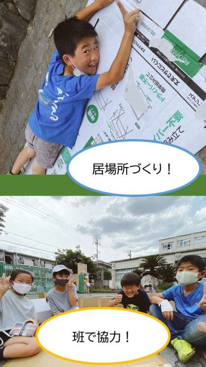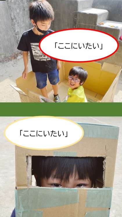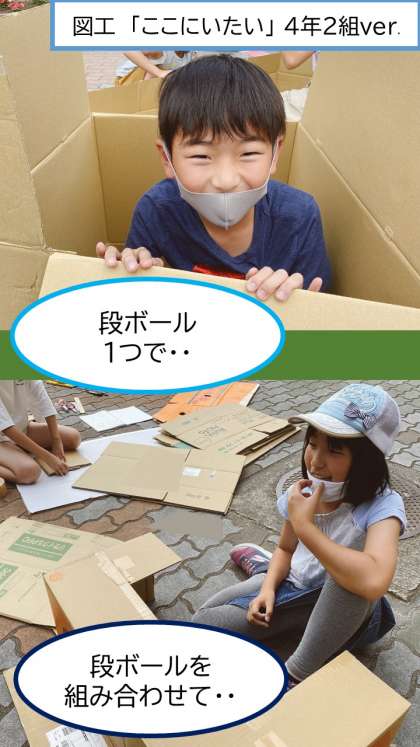 「ここにいたい!」と思うことができるような環境を,段ボールを組み合わせて作りました。価値観は人それぞれですが,班のみんなが「ここにいたい!」と思うには何が必要なのかを試行錯誤をしながら進めていました。