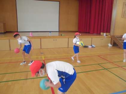 体育では「ボール運動」に挑戦しました。高く上げたボールをキャッチしたり,強く床に打ちつけたボールをキャッチしたりといろいろなボール運動に楽しく取り組むことができました。汗いっぱいかいて最後まで頑張りました!