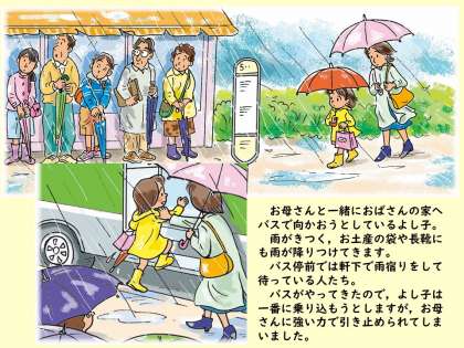 道徳で「雨のバスていりゅうじょ」というお話からみんなが気持ちよく生活していくために大切なことを考えました。
