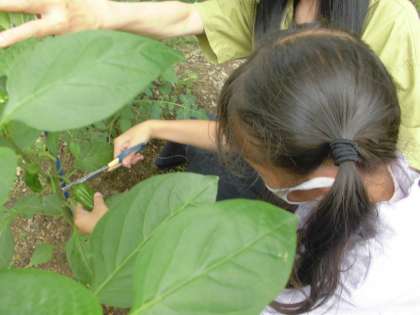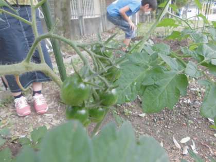 なかよしで育てている夏野菜。雨がたくさん降ってぐんぐん大きくなってきました。今日はピーマンを二つ収穫できました。大きくなったピーマンに驚いたり,においをかいだりして嬉しそうななかよしのみんなでした。